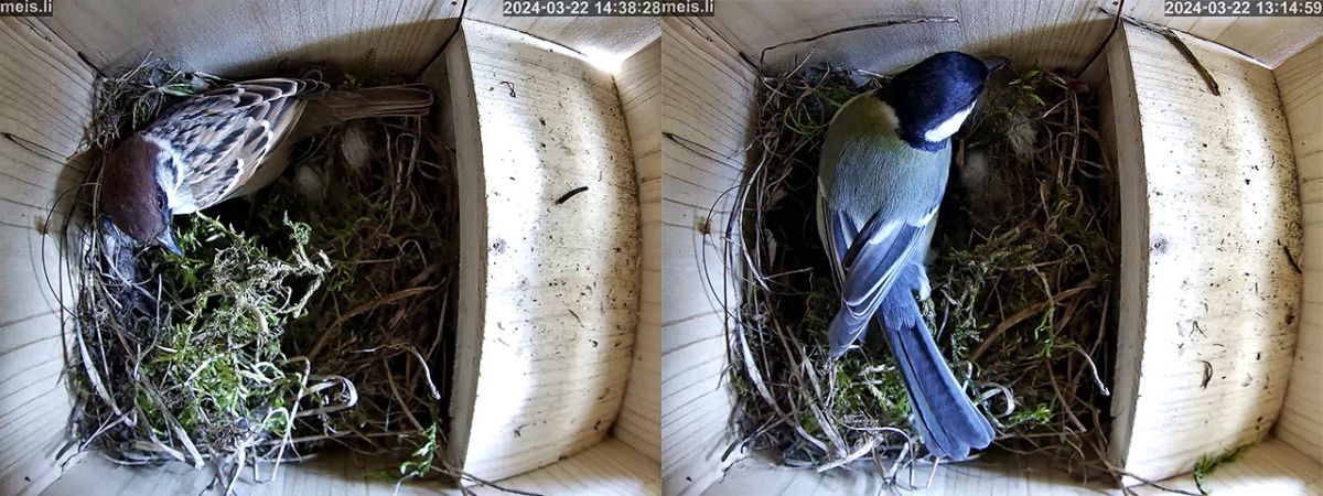 Das hatten wir noch nie: Eine Kohlmeise und ein Feldspatz bauen ihr Nest im Kasten. Das Nest besteht aus abwechselnden Schichten von Halmen (Spatz) und Moos (Meise). Nachts schläft die Meise im Kasten. Manchmal begegnen sich die beiden, dann fliegen ein paar Federn.