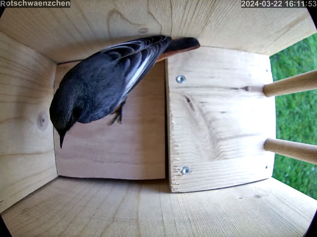 Die Rotschwänzchen sind zurück aus ihrem Winterquartier in Afrika. Heute wird unser Kasten von einem schönen Männchen inspiziert. Hoffentlich kann er seine Frau überzeugen, hier ihr Nest zu bauen.