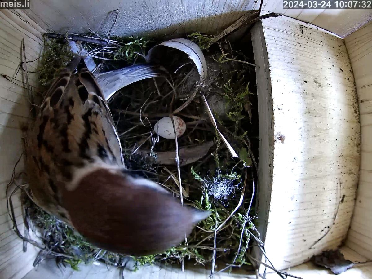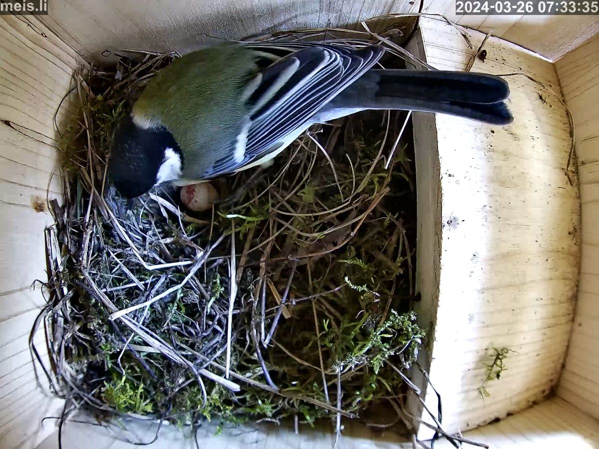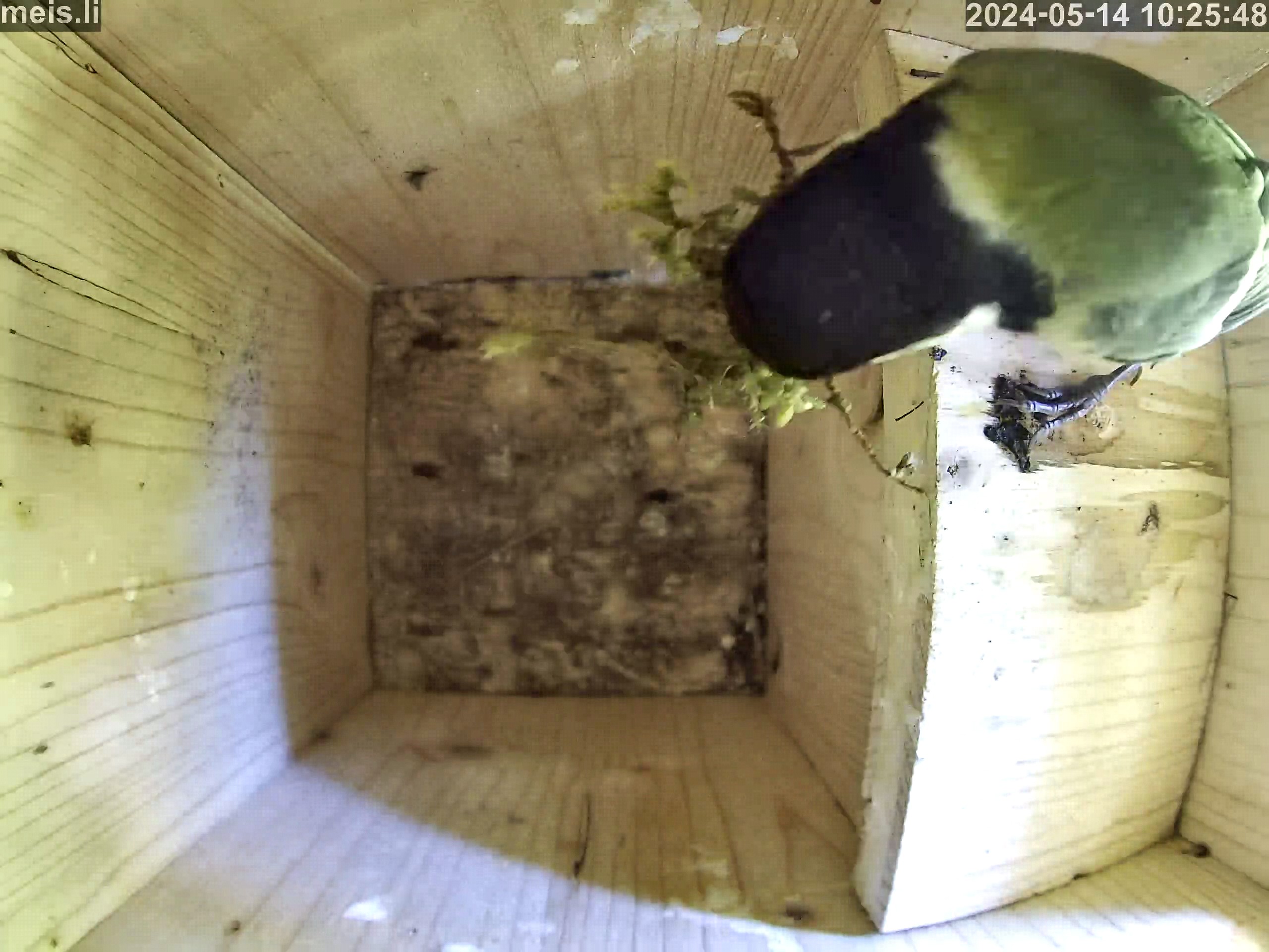 Die Meise legt heute ihr zweites Ei. Herr Meise hat das Nest erfolgreich verteidigt. Der Spatz war nicht mehr im Kasten.