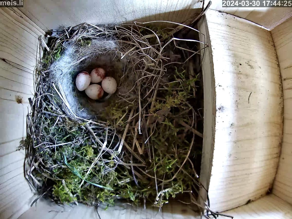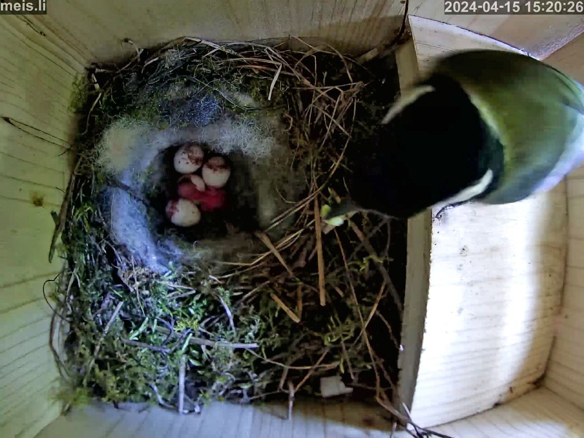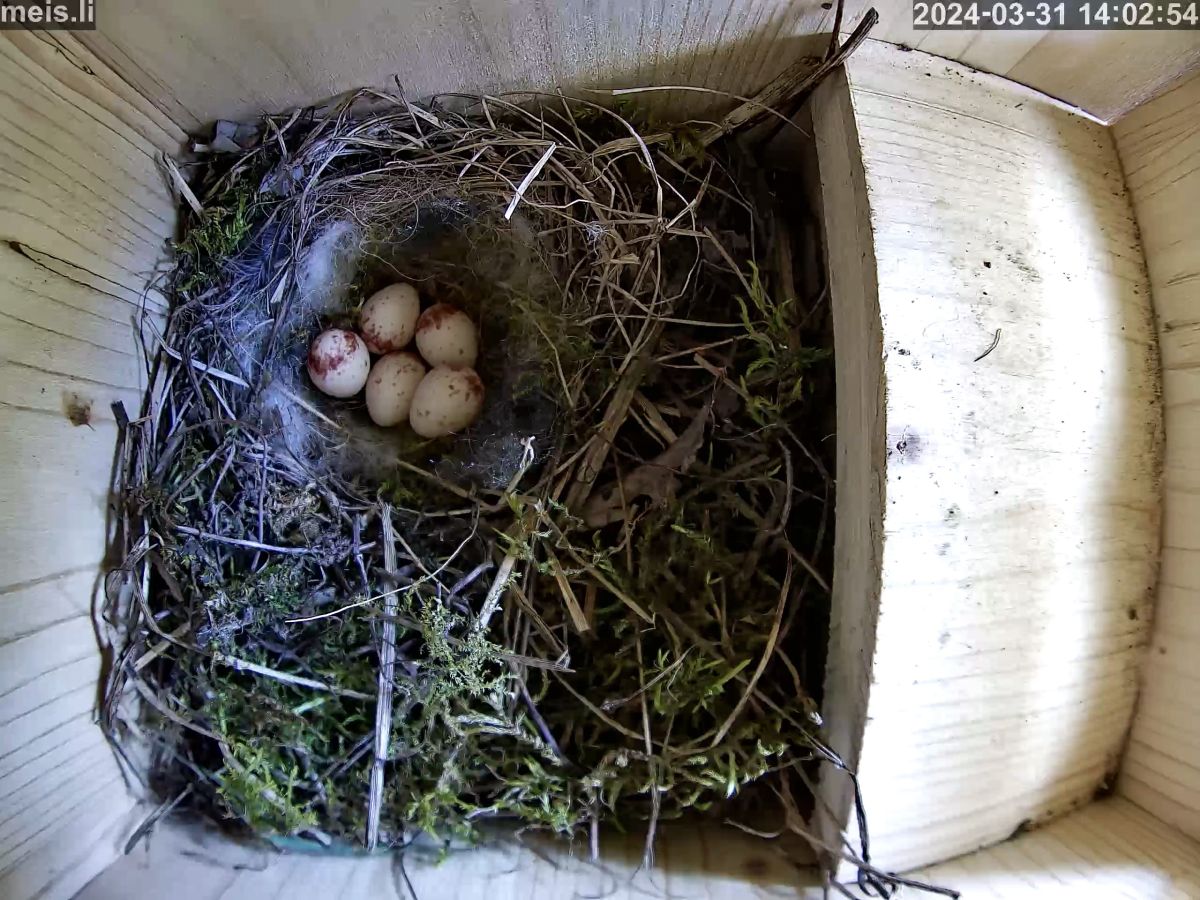 Seit dem 31.3. ist kein Ei mehr hinzugekommen. Die Meise brütet jetzt. Wir erwarten den Schlupf um den 14. April.