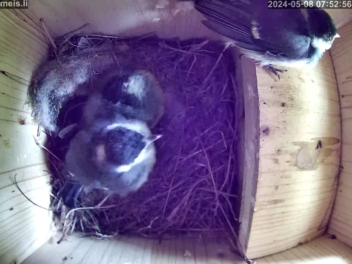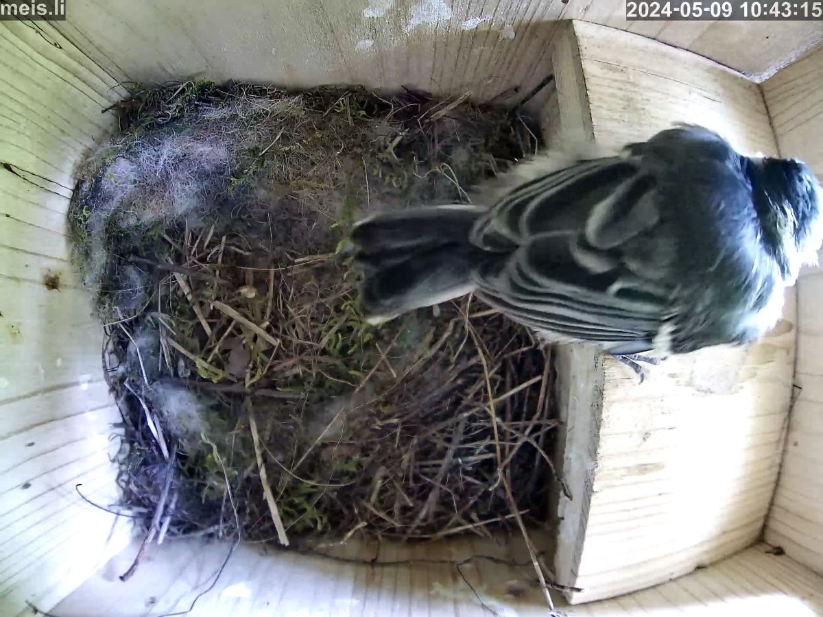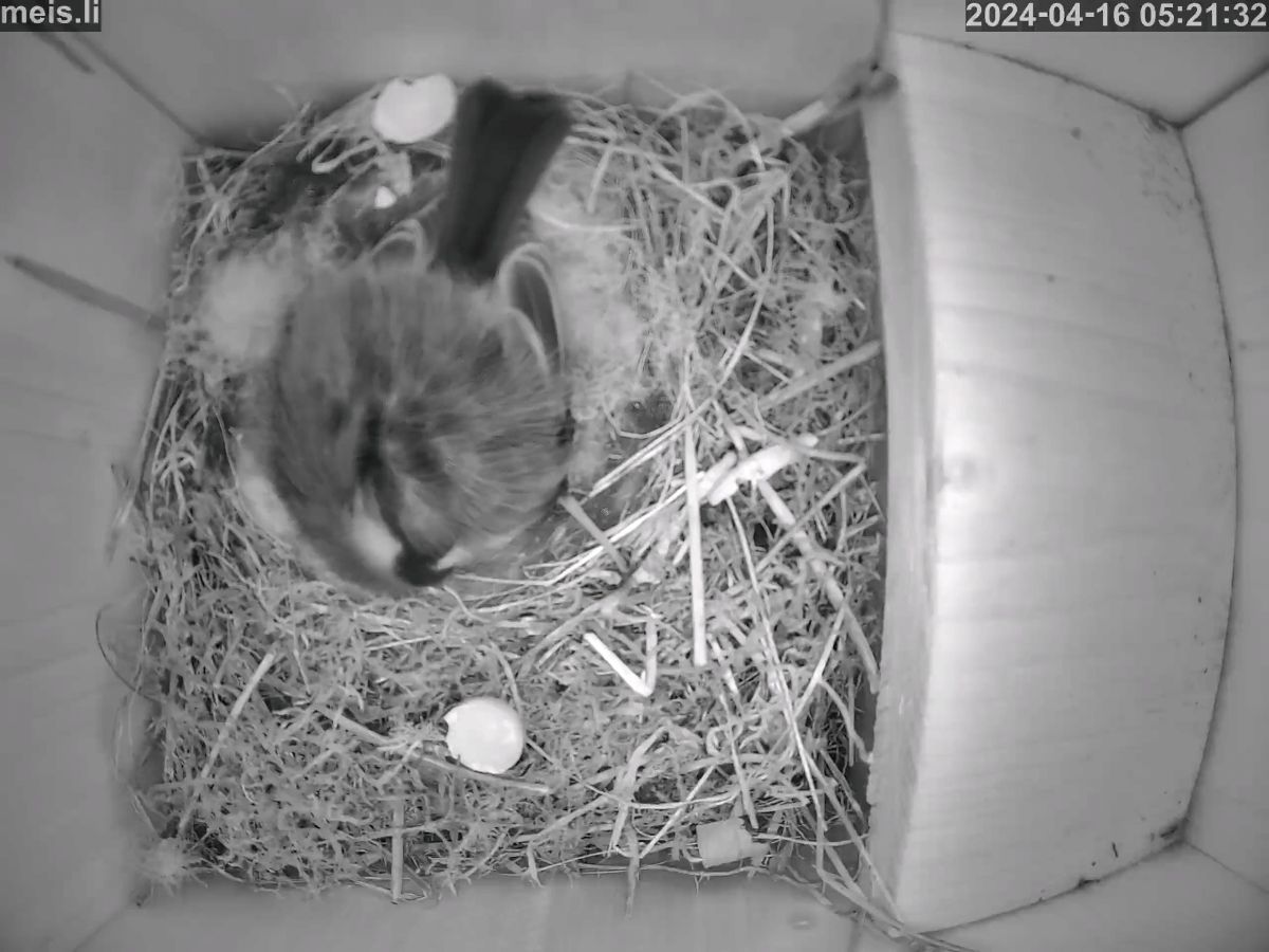 Am Morgen liegen Eierschalen im Nest. Offensichtlich sind weitere Meisen geschlüpft.